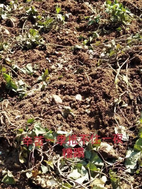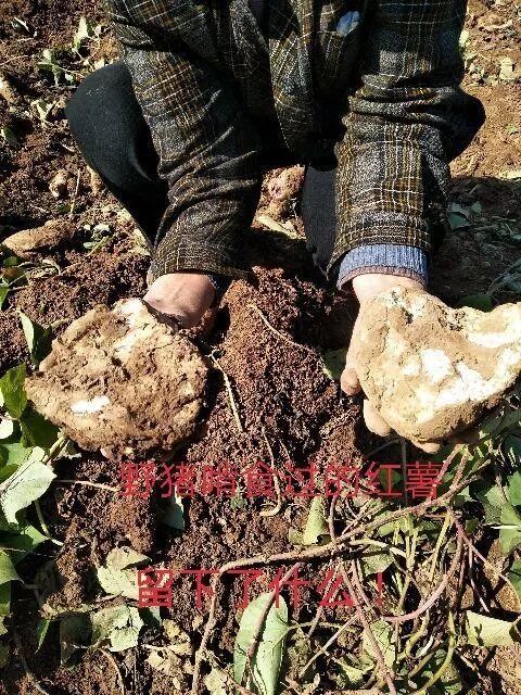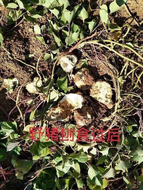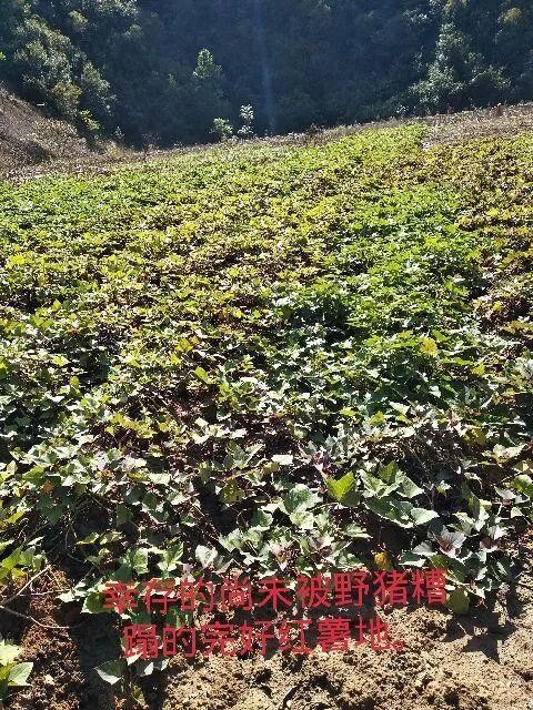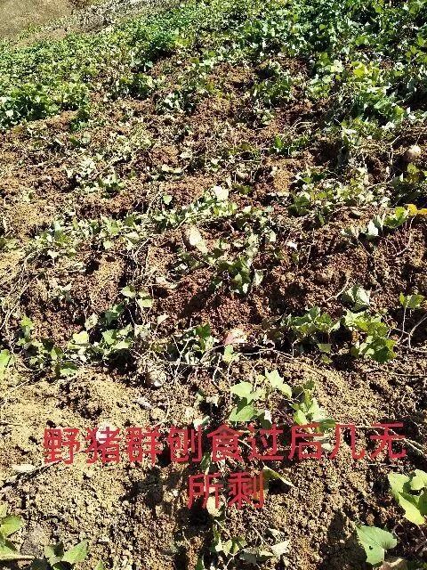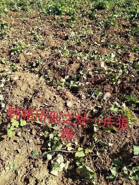 殊不知,不是人们吃不到野猪,是野猪肆虐到就要吃了人了!每年回家都陆续听到家里人提到:今年野猪又把地里的花生刨食了一半,地里的红薯还不熟都快被野猪吃完了,山里的地太远没种了野猪群都跑到村子附近来吃庄稼了等等。没有亲眼所见,没有切身体会,只听到家里人一声沉重无奈的叹息,只是在心里担心着野猪越来越多,越来越胆大,有一天野猪不会跑到家门口伤到人吧!直到今年秋天回家,亲眼目睹了野猪肆虐刨食毁坏庄稼的暴行,才理解了家里人的那声叹息。看吧,如图,野猪一夜之间刨食毁完了半边地,马上就该收秋了,秋收还能收什么!发现的还剩下的一半,若是放任不管,再过一天,一块地的红薯估计就全没了。