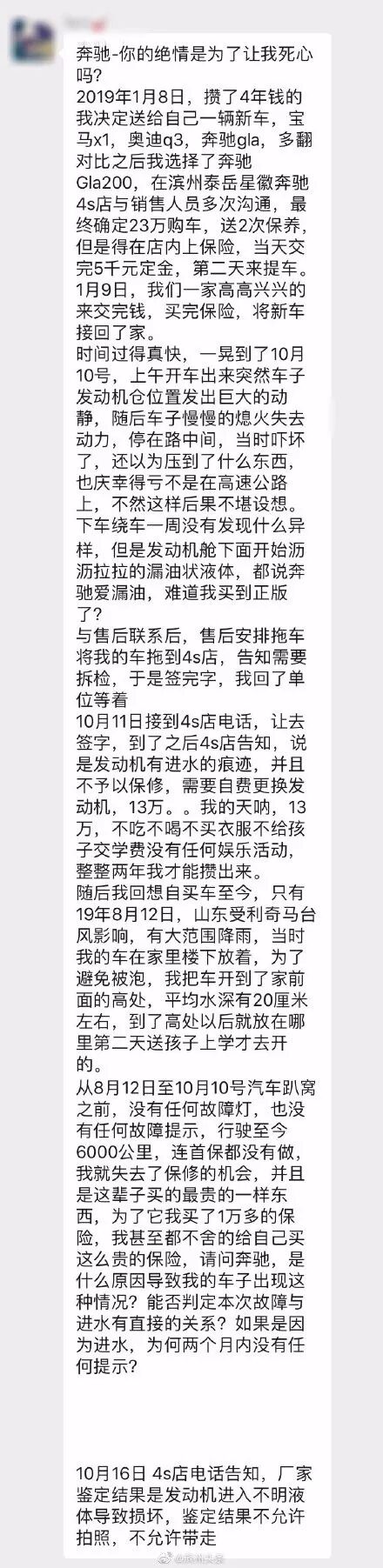 10月20日,滨州街头,一女子骑着一匹马拉着一辆白色奔驰车,车上拉着横幅,上面写着:“奔驰行驶六千公里发动机报废,厂家让天价自费更换,权益何在”