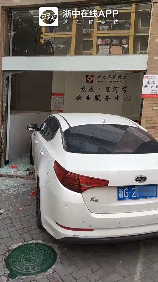 昨天上午9点多,婺城新区金江南街上的竟达星河湾小区物业办公室里,突然有一辆白色轿车冲破玻璃门,撞了进来。这到底是怎么一回事?