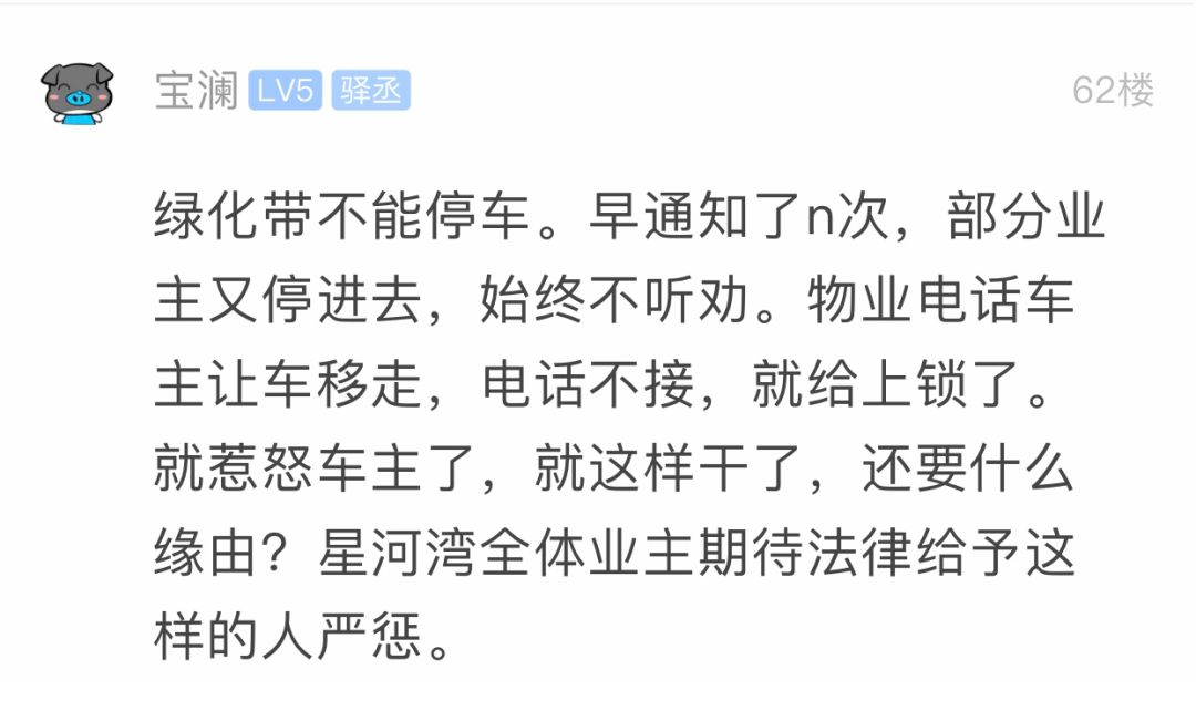 竟达星河湾小区物业项目经理 张寒:锁完之后你跟我们讲一下,下次不会停绿化带上,不会再碾压绿化,我们会及时开锁的。