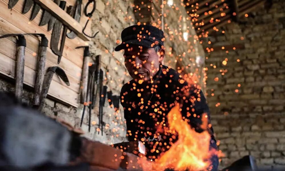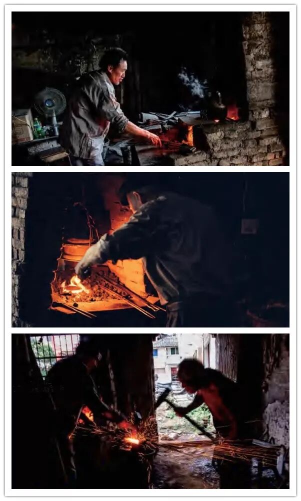 俗话说:“世上三行苦,撑船打铁磨豆腐。”一语道出了打铁这个行业的艰辛。由于没有机器助力,打下料、热熔、打扁、剁尖、做弯、蘸火等工序都要靠人力完成,铁匠铺里一年到头熊熊的炉火、当当的响声、铮铮的铁骨……
