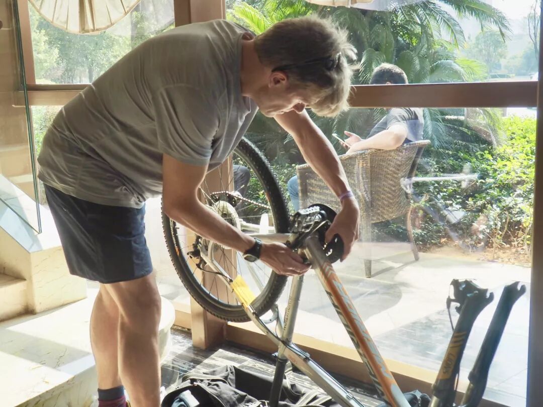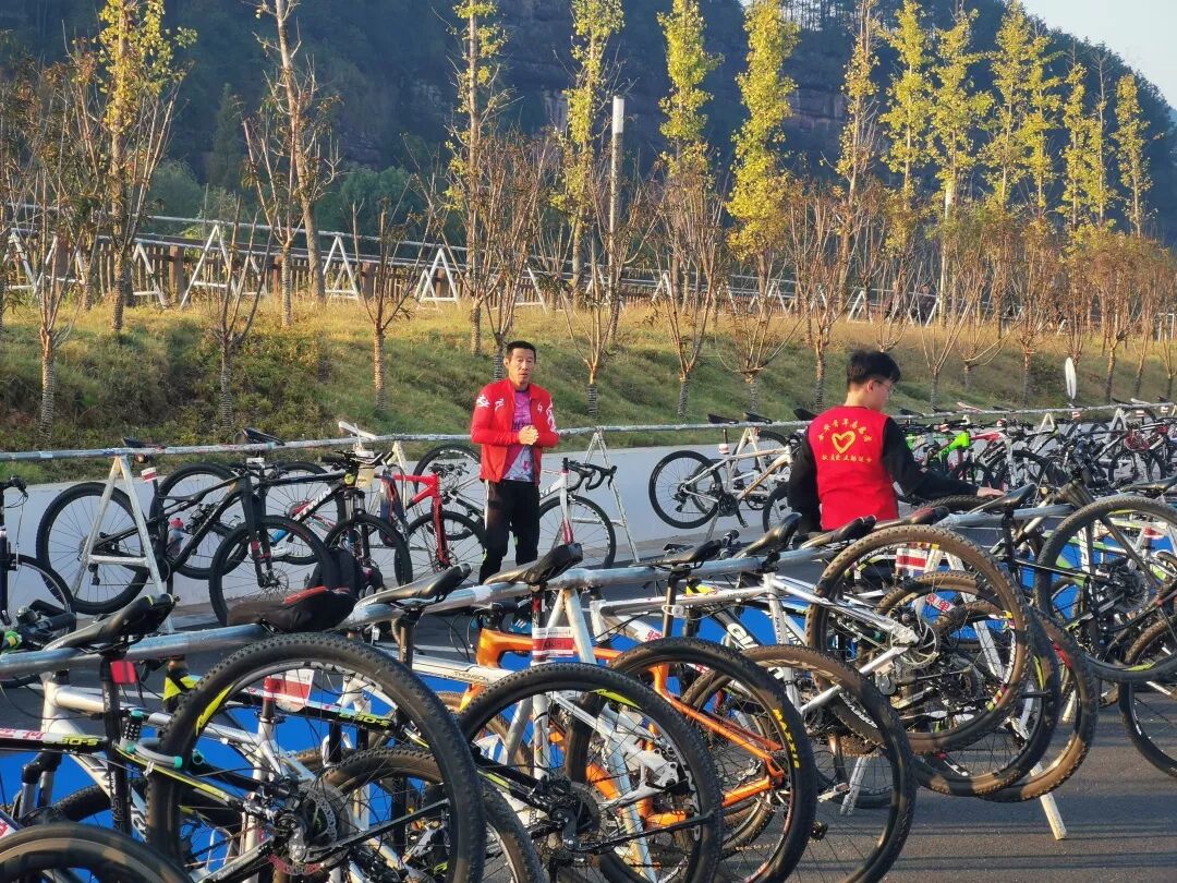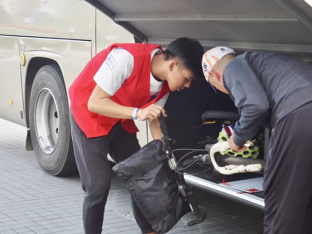 在自行车组的志愿者们负责将他们的车子摆放整齐,存包组的志愿者们在运动员快来之时,迅速把包递给他们,为他们节约时间。