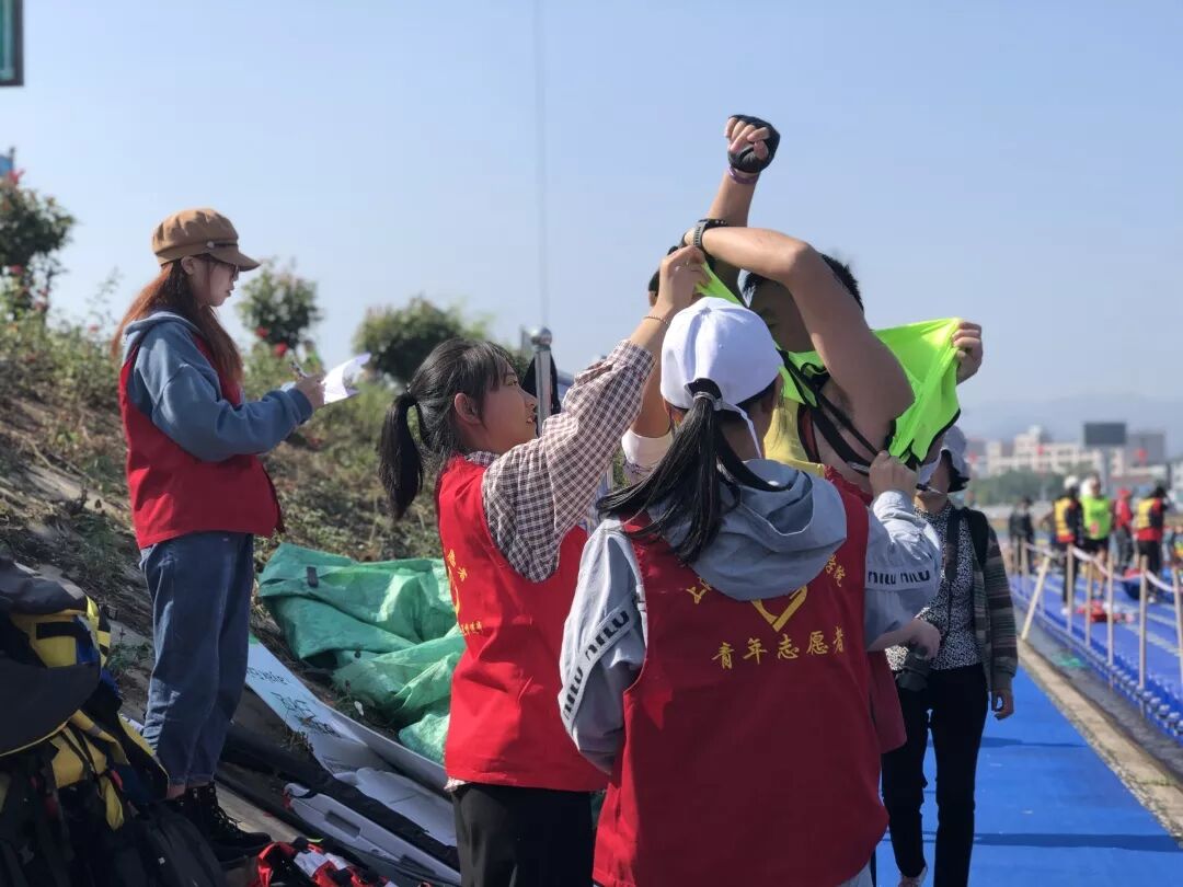 皮划艇的志愿者们则负责为参赛者们穿好救生衣和号码衣,为参赛者们的安全保驾护航。
