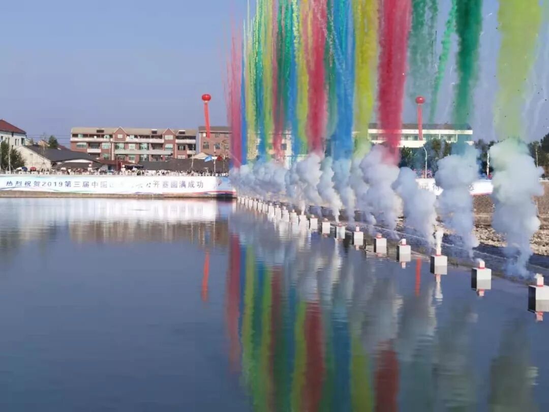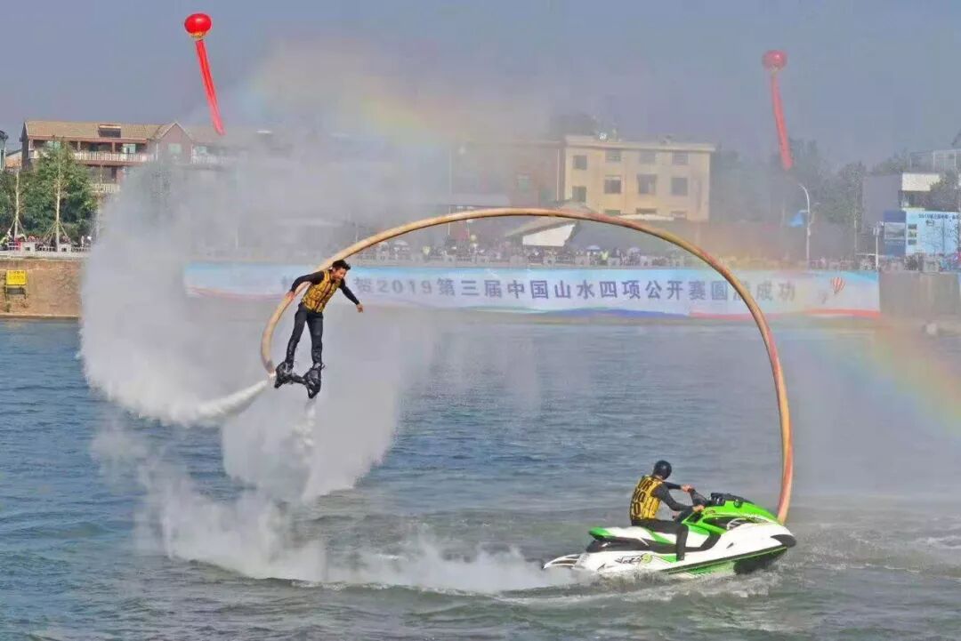 宣布开幕的同时,礼花齐放,水上节目精彩上演,为山水四项助彩!