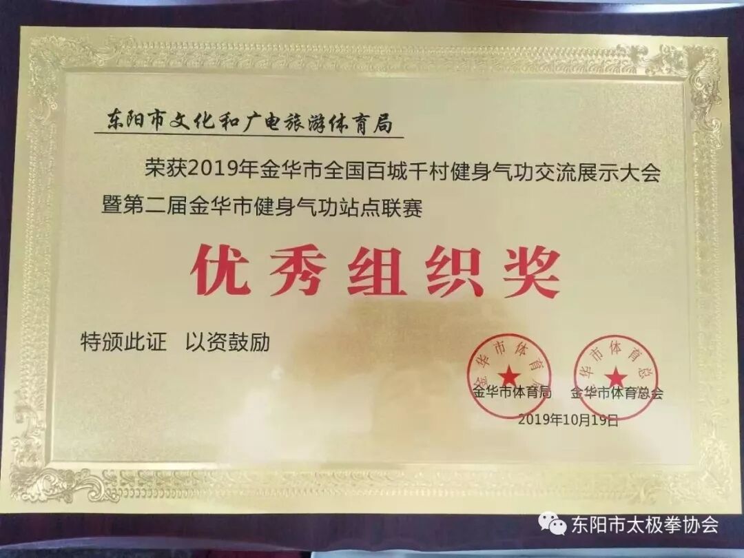 近年来,东阳市积极开展健身气功活动,通过“进学校、进机关、进企业、进社区、进农村”等卓有成效的“五进”工作,正确引导、培育发展了一大批健身气功习练爱好者,使健身气功在大众的影响力与日俱增,这一凸显中华民族哲学和气韵、简单易学且极具养生效果的项目,已在东阳各地开花结果,成为群众日常健身活动中不可或缺的一部分。目前,全市已建立7个健身气功站点。本次活动中,50名运动员代表东阳市参加了“八段锦”方阵的展示演练,东阳市文广旅体局荣获优秀组织奖。
