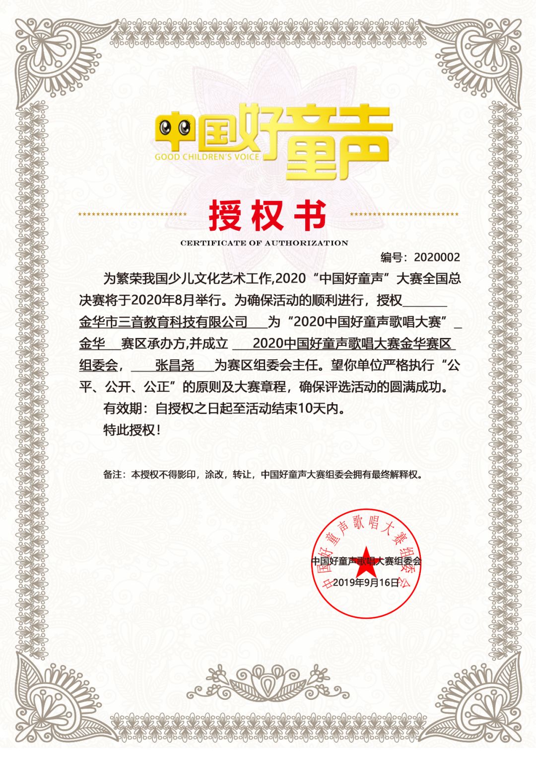 为繁荣我国少儿文化艺术工作,2020“中国好童声”大赛全国总决赛将于2020年8月举行。为确保活动的顺利进行,授权 金华市三音教育科技有限公司 为“2020中国好童声歌唱大赛” 金华 赛区承办方,并成立 2020中国好童声歌唱大赛金华赛区组委会, 张昌尧 为赛区组委会主任。