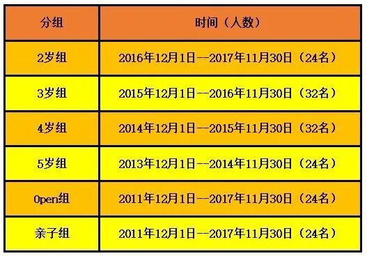 年龄分组:本次赛事分为2岁组,3岁组,4岁组,5岁组,Open组(2-8周岁以内)、亲子赛(2-8周岁以内)