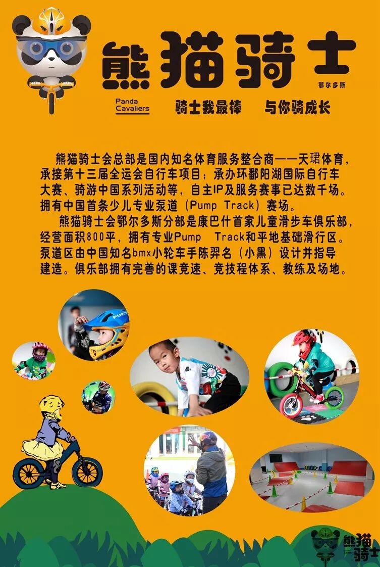 熊猫骑士会(鄂尔多斯)于2018年加盟天珺体育旗下熊猫骑士,现拥有占地800多平的室内场地,分为综合基础区和Pump Track室内压抬场,室内压抬场地由知名小轮车手小黑哥哥(陈羿名)设计并指导修建。实现了课程体系、产品售卖研发、体育旅游、赛事活动策划、全系改装等与深圳总部的完美对接,为鄂尔多斯少儿家庭提供最完全、最专业、最暖心的服务。