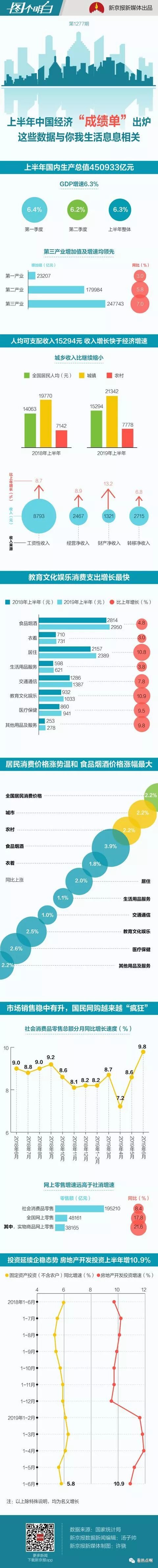 7月15日国家统计局网站发布2019年上半年全国经济发展主要数据。经初步核算,上半年中国国内生产总值450933亿元,按可比价格计算,同比增长6.3%。