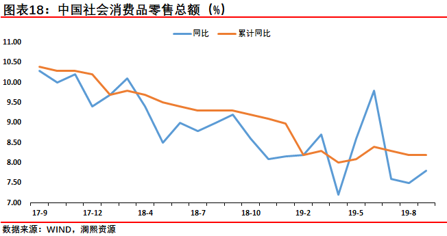 【20191018 中国9月经济运行】中国9月社会消费品零售总额同比增长7.8%,预期7.8%,前值7.5%。中国9月规模以上工业增加值同比增长5.8%,预期5.2%,前值4.4%。中国前三季度固定资产投资(不含农户)同比增长5.4%,预期5.5%,1-8月增速为5.5%。 9月份,社会消费品零售总额34495亿元,同比增长7.8%,符合预期。其中,除汽车以外的消费品零售额31097亿元,增长9.0%,较8月份降低0.3个百分点。从产品看,9月份,粮油食品类,化妆品类、日用品类产品消费保持两位数的增长,增速较平稳,其中,化妆品类增速9月份出现加快,较8月份增加0.6个百点。汽车类、石油及制品类商品零售9月份持续出现负增长,但降幅较8月份有所收窄。中国9月规模以上工业增加值同比增长5.8%,高于预期与前值。当月工业增加值增长加快有三大原因:一是去年9月当期基数相对较低;二是今年9月部分企业在季末有加快生产销售的计划安排;三是从工业自身情况看,受市场预期影响,企业扩大生产的动力有所增强。前三季度,全国固定资产投资(不含农户)同比增长5.4%,比前8个月小幅放缓0.1个百分点,增速总体上平稳。从投资结构看,在三次产业中,第三产业投资增长7.2%,其中基础设施投资增长4.5%。高技术制造业投资同比增长12.6%,增速比全部投资快7.2个百分点;高技术服务业投资增长13.8%,增速比全部投资快8.4个百分点。