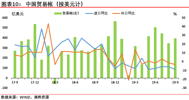 受中美贸易战和全球经济持续放缓共同影响,9月中国进出口增速双双负增长,降幅较8月进一步扩大,且超过预期值。其中,9月加工贸易进口出现了较大幅度的下滑,预示着未来出口前景难言乐观。