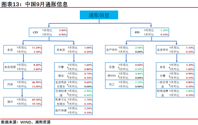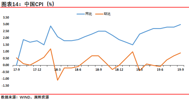【20191015 中国9月通胀信息】中国9月CPI同比3.0%,预期2.9%,前值2.8%。中国9月PPI同比下降1.2%,预期下降1.2%,前值下降0.8%。9月CPI同比增速加快至3.0%,时隔6年重返“3时代”。其中,当月猪肉价格同比大幅上涨69.3%,贡献CPI涨幅的一半以上。而在消费疲弱背景下,同期非食品价格仅上涨1.0%,凸显本轮物价上涨具有鲜明的结构性特征,缺乏持续大幅上行动力。9月PPI同比跌幅加深,主要原因是需求疲弱,上游大宗商品价格持续承压,加之上年同期基数抬高。