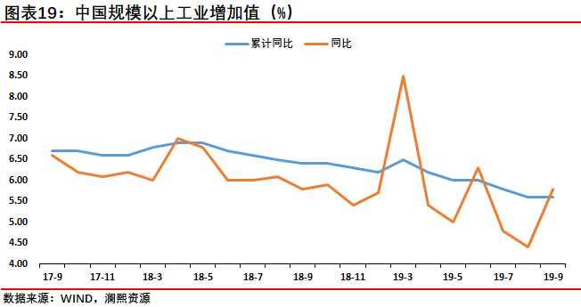 受中美贸易战和全球经济持续放缓共同影响,9月中国进出口增速双双负增长,降幅较8月进一步扩大。受猪肉价格上涨的影响,9月CPI同比增速加快至3.0%。9月PPI同比跌幅加深至1.2%。中国9月社会消费品零售总额同比增长7.8%,符合预期。中国9月规模以上工业增加值同比增长5.8%,高于预期与前值。前三季度,全国固定资产投资(不含农户)同比增长5.4%。中国第三季度GDP同比增长6%,创27来新低。