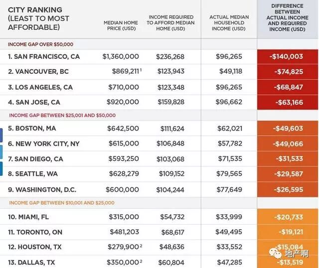 根据研究结果,最难负担得起的市场是旧金山,旧金山市的房价中位数是$1,360,000美元,需要的年收入中位数是$236,268,而买房的中位数收入家庭,其年收入平均为$96,265美元,也就是说,年收入比他们应该需要的年收入中位数,还少了$140,003美元。