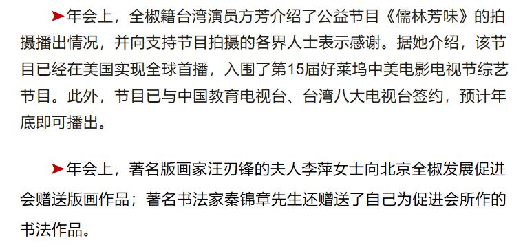 年会上,全椒籍台湾演员方芳介绍了公益节目《儒林芳味》的拍摄播出情况
