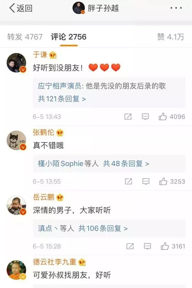 可以说,孙越、烧饼发布单曲的时候,微博底下都是一片热闹,这其中不仅有两人的粉丝,更有德云社的众多大咖红人,比如于谦、张鹤伦都先后送上了祝福。