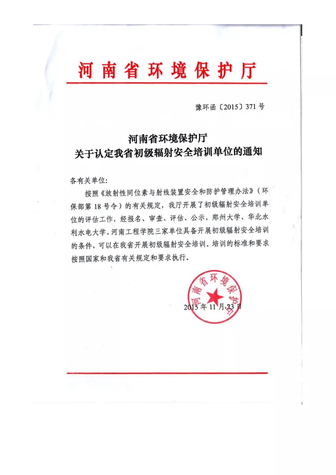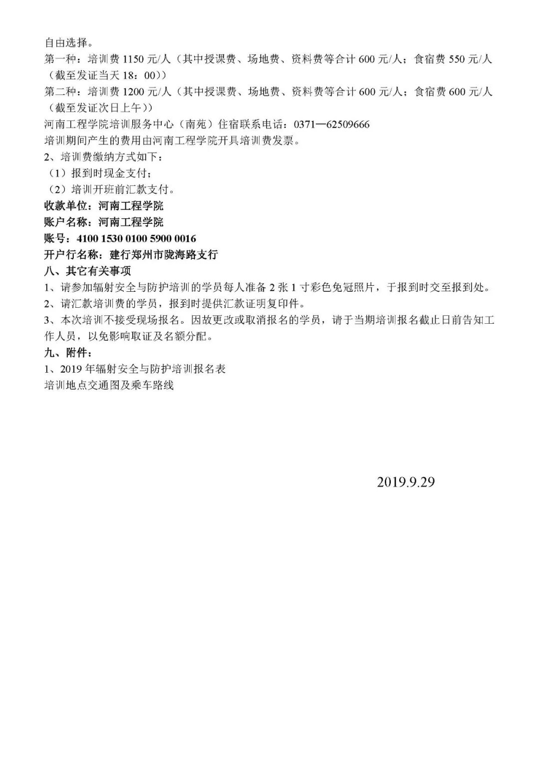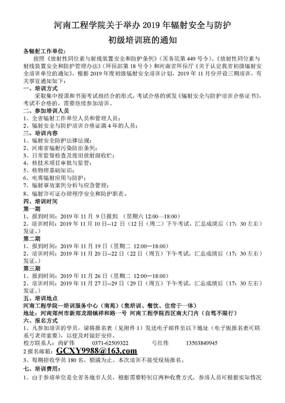 关于举办2019年河南工程学院辐射安全与防护工作人员初级培训的通知11月份