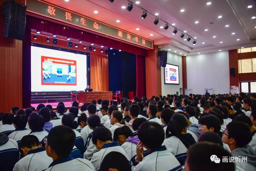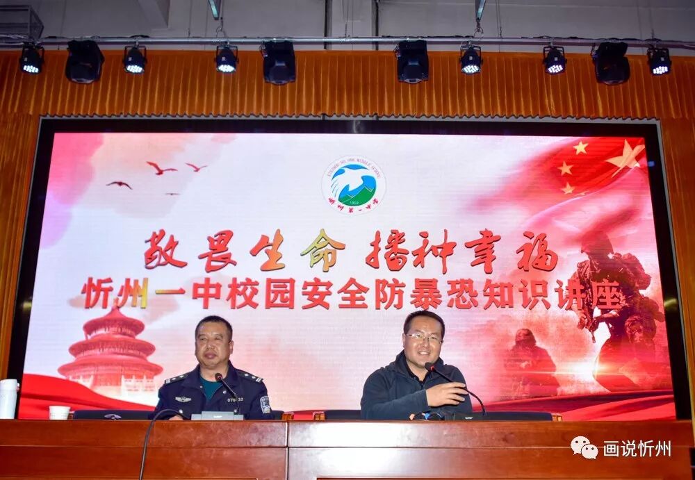 为了进一步加强校园安全教育宣传,提高师生法制意识、安全防范意识和自我保护能力,增强校园师生安全感,营造和谐、健康、安定的校园环境。10月19日下午,忻州市第一中学在校报告厅举行了一场以“敬畏生命,播种幸福”为主题的校园安全防暴恐知识讲座,特邀全国、全省公安系统优秀教官、忻州市公安局教官、巡特警支队民警刘建斌主讲。忻州一中政教处副主任贾斌主持,主任王新林为刘教官颁发了“校园安全教育辅导员”聘书,1700余名师生聆听了讲座。