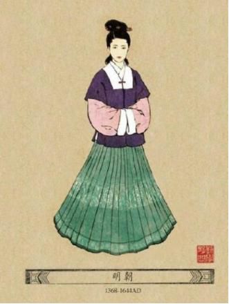 明朝立国不久,就下令禁穿胡服,恢复了唐朝衣冠制度。明朝服饰属于汉族传统服饰体系。明初褶裙十分盛行,有细密褶纹,也有大褶纹。明朝也流行“凤尾裙”,数根绣花鸟纹饰镶金线的彩条拼合在腰带上。