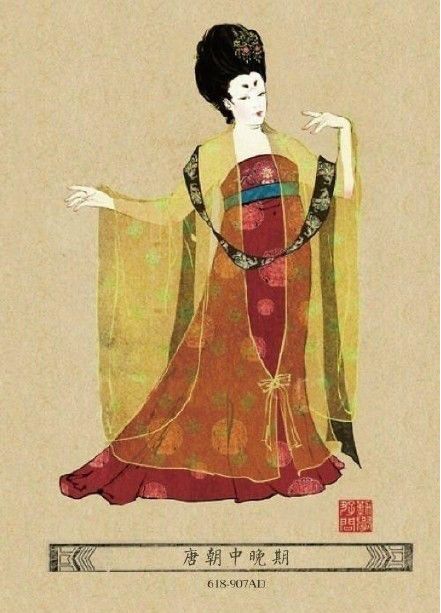 时至隋唐,国家统一,经济繁荣,形制更加开放,服饰愈益华丽。在妇女中间,出现了袒胸露臂的形象,只有有身份的人才能穿开胸衫,歌女可以半裸胸以取悦于统治阶级,而平民百姓家的女子是不许半裸胸的。唐代的裙子颜色绚丽,红、紫、黄、绿争艳斗妍。