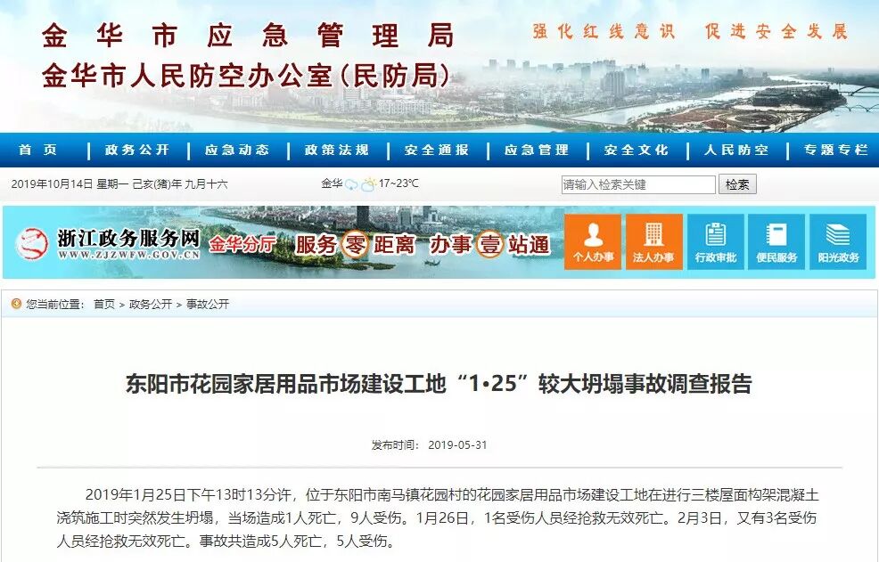2019年1月25日下午13时13分许,位于浙江东阳市南马镇花园村的花园家居用品市场建设工地在进行三楼屋面构架混凝土浇筑施工时突然发生坍塌,当场造成1人死亡,9人受伤。1月26日,1名受伤人员经抢救无效死亡。2月3日,又有3名受伤人员经抢救无效死亡。事故共造成5人死亡,5人受伤。