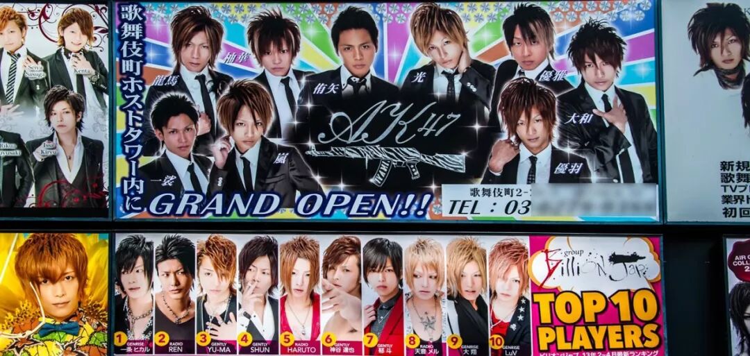在东京有一名物决不能忽略,那就是牛郎店。有的牛郎店光是周末上班就能赚60w人民币,所以牛郎店的招牌不能像简约的無料案內所一样只是字就完了,一定得把头牌帅哥贴到招牌上,用颜值迷晕女顾客,然后她们就会主动走进店里并为牛郎的酒水业绩买单。