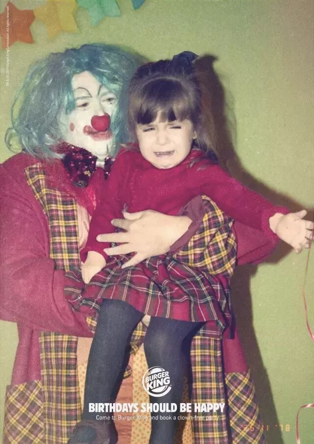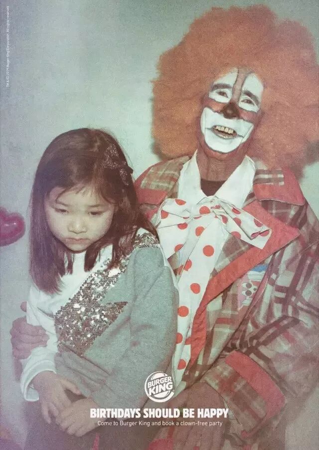 汉堡王还借势《小丑回魂》电影中恐怖小丑带给大众的心理阴影,专门设计了一系列小丑与儿童海报,配上文案:过生日本该开心,别找吓哭孩子的小丑们。