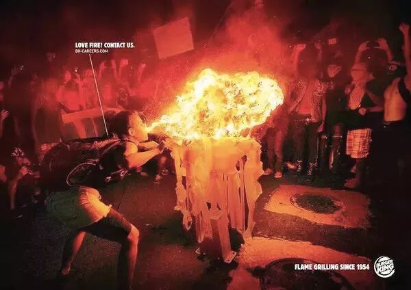 甚至,汉堡王在招聘广告上也玩火。德国汉堡王发布一组平面广告,以火为主题向人们发出“Love Fire?Contact us”的邀请,真是无时无刻不在向用户灌输自身的品牌特点。