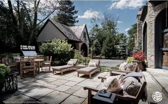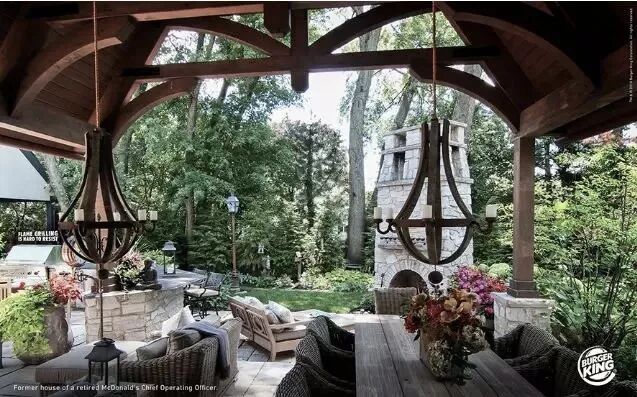 汉堡王还十分擅长“以子之矛,攻子之盾”的营销套路。2018年,汉堡王的平面广告是一组麦当劳退休高管的私人住宅,奇妙之处在于院落中无处不在的烧烤架,且每一处烧烤架上方文案写着:“flame grilling is hard to resist”(火焰烧烤令人难以抗拒)”。表达汉堡王皇堡更健康、更好吃,连麦当劳的内部人员都喜欢。