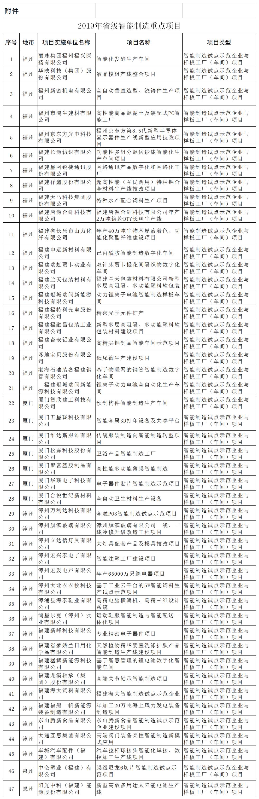 福建省工业和信息化厅关于印发2019年省级智能制造重点项目的通知闽工信装备〔2019〕520号