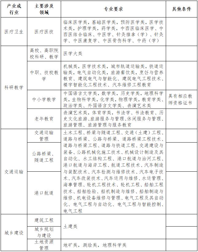 注意:1.表格中某产业或行业、某主要涉及领域所对应的专业要求和其他条件是指该产业或行业、该主要涉及领域紧缺急需人才所需要的专业要求和其他条件,对应的专业要求所列专业及类别之外的专业不属于该产业或行业、该主要涉及领域的紧缺急需专业。