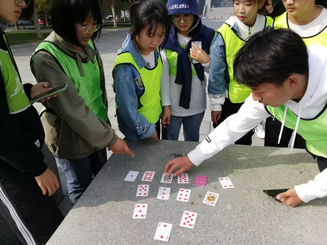 游戏规则:四种花色的扑克牌分别打乱顺序,随机摆放,队员们随机翻开扑克牌,从数字1开始排序,若不是1,则扣上下一位同学接着翻开,直至翻开所有的扑克牌,顺序一定要从1开始排序。