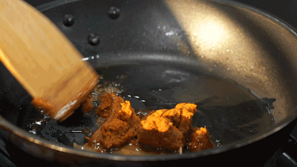 放入咖喱酱炒香;倒入椰粉、水搅匀