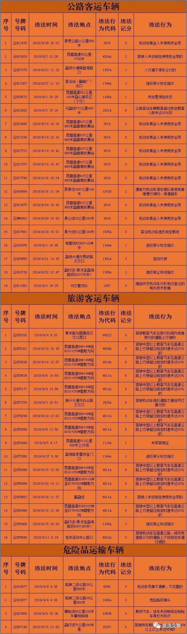 为保障景洪市道路安全畅通,确保不发生较大道路交通事故,努力为人民群众创造平安、畅通、和谐的道路交通环境,结合全市道路交通管理工作实际,景洪交警大队认真开展辖区营运车辆和驾驶人交通违法行为集中清理工作,先后对辖区内10家客货运输企业的各类营运客货运输车辆1253辆,驾驶人1466人,开展了交通违法行为集中清理,截止2019年9月30日,共清理各类道路交通违法行为39起,记分99分,具体违法信息公布如下: