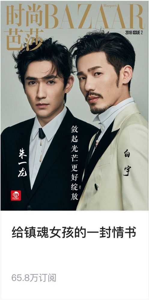 2018年7月,朱一龙和白宇登上了《时尚芭莎》电子刊的创刊,主题是《给镇魂女孩的一封情书》,正式将电子刊变为了付费阅读。这期电子刊在电视剧《镇魂》的高热度加持下,迅速售出了六十余万本,一度成为后续粉丝衡量电子刊销量的标杆。 现在,电子刊大多通过微信小程序出售,相比传统杂志,电子刊的形式的确更多样,高清图片、采访视频、独家花絮通通囊括,还节约了出刊成本和出刊时间。时尚芭莎曾透露,朱一龙和白宇的这期电子刊从策划到出街完整流程下来,只花了2周时间。