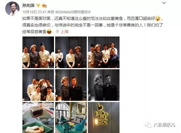 自从范冰冰出现事情之后,和李晨维持三年的感情如今也已经分手,除了补上了巨大的漏洞,如今的事业也面临阻碍,看来和李晨没有要和好的机会了。不过她依然积极约见各方大佬,想尽办法重新开始,但是网友们却不愿意。在昨天有人看到烹饪大师孙兆国晒出了和范冰冰的同框照,据了解当时是现身上海和朋友聚餐。
