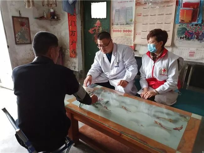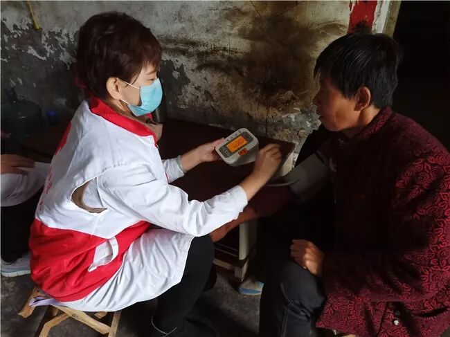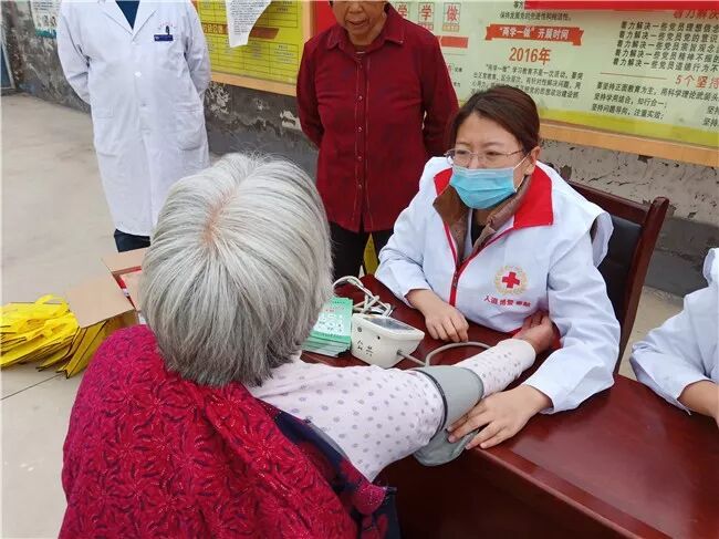 义诊现场,红十字志愿者和医务人员认真为每一位村民进行查体,提供免费量血压、测血糖、义诊、健康咨询等服务,医护人员详细回答村民疑问,并为他们详细讲解医保政策,国家基本公共卫生服务项目,特别告知贫困户还可以享受免费体检服务。