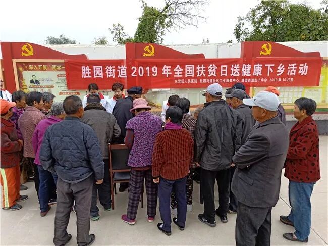 10月17日,在全国扶贫日到来之际,为进一步巩固脱贫攻坚工作成效,提高贫困人口政策知晓率,东营区胜园街道红十字会会同街道社区卫生服务中心医务人员来到东升村村委大院开展健康扶贫义诊活动。
