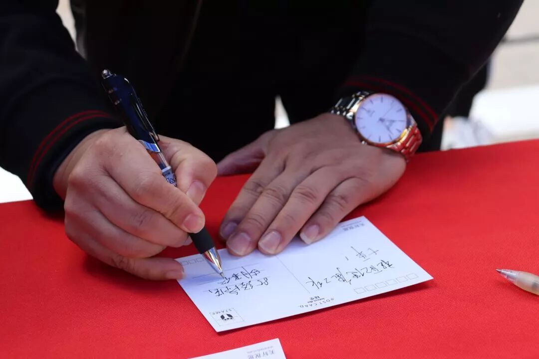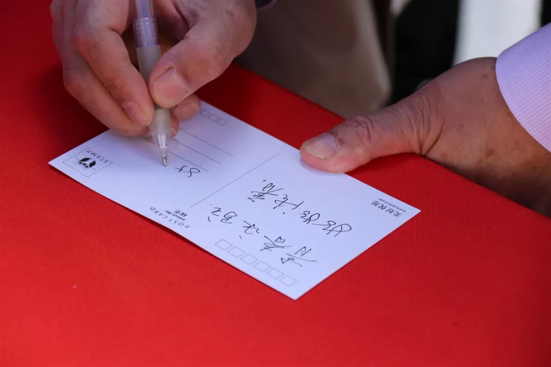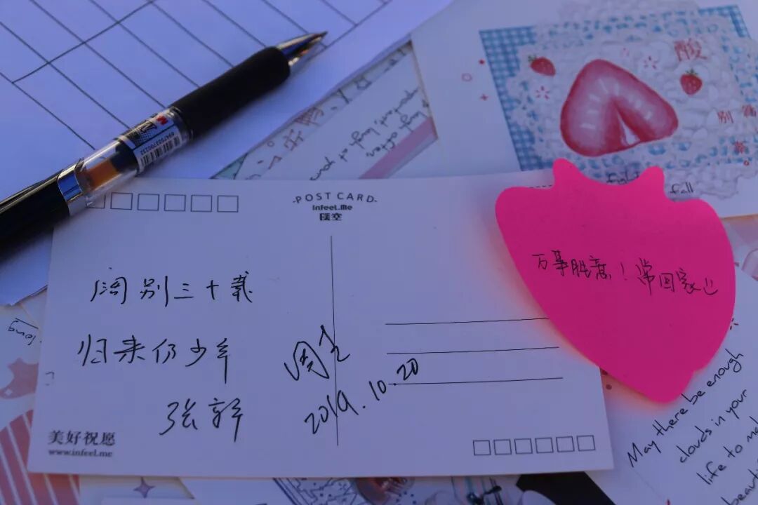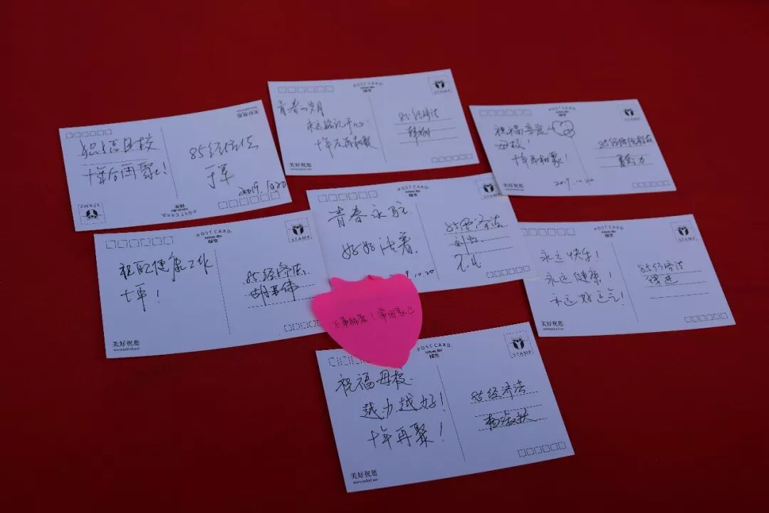 学姐学长们在明信片上留下寄语。明信片会在他们再度返校之际被交到十年后的他们手中。岁月流逝,情谊长青!