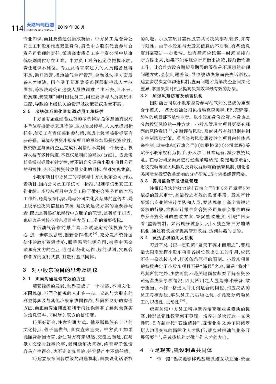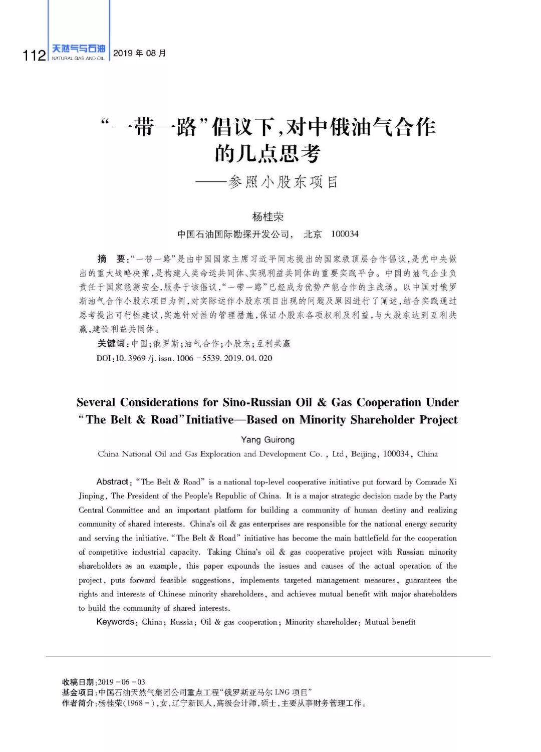 摘要:“一带一路”是由中国国家主席习近平同志提出的国家级顶层合作倡议,是党中央做出的重大战略决策,是构建人类命运共同体、实现利益共同体的重要实践平台。中国的油气企业负责任于国家能源安全,服务于该倡议,“一带一路”已经成为优势产能合作的主战场。以中国对俄罗斯油气合作小股东项目为例,对实际运作小股东项目出现的问题及原因进行了阐述,结合实践通过思考提出可行性建议,实施针对性的管理措施,保证小股东各项权利及利益,与大股东达到互利共赢,建设利益共同体。