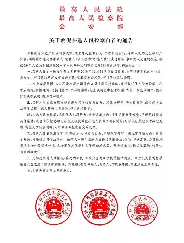 2019年7月24日公安部新闻发布会公布了最高人民法院、最高人民检察院、公安部联合印发的《关于敦促在逃人员投案自首的通告》最高法、最高检、公安部一起敦促网逃投!案!自!首!