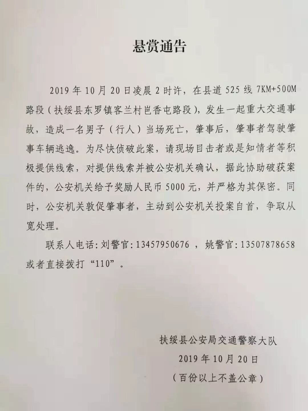 2019年10月20日凌晨2时许,在县道525线7Km+500m路段(扶绥县东罗镇客兰村岜香屯路段),发生一起重大交通事故,造成一名男子(行人)当场死亡,肇事后,肇事者驾驶肇事车辆逃逸。为尽快侦破此案,请现场目击者或是知情者等积极提供线索,对提供线索并被公安机关确认,据此协助破获案件的,公安机关给予奖励人民币5000元,并严格为其保密。同时,公安机关敦促肇事者,主动到公安机关投案自首,争取从宽处理。