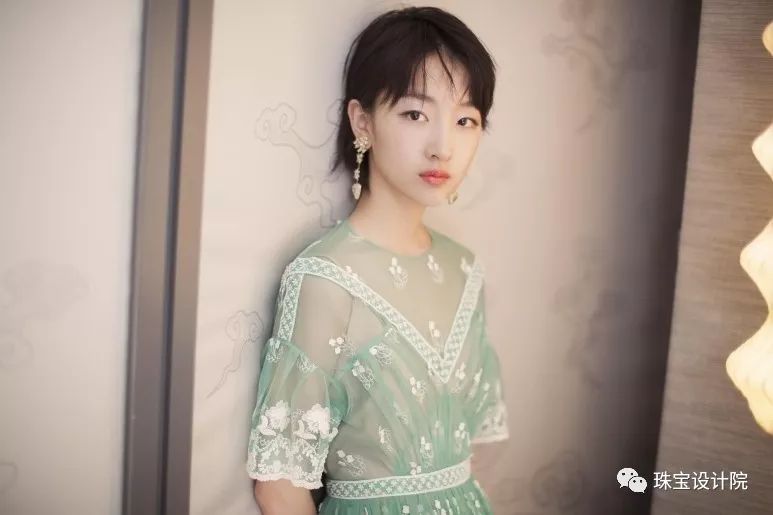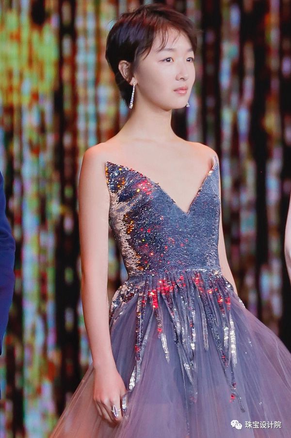 周冬雨身穿MiuMiu金色礼服,佩戴Qeelin Wulu系列珠宝,以邻家少女的形象展示在观众面前。Qeelin Wulu系列白金镶钻石大号葫芦戒指,Qeelin Wulu系列白金镶钻石葫芦流苏耳环。