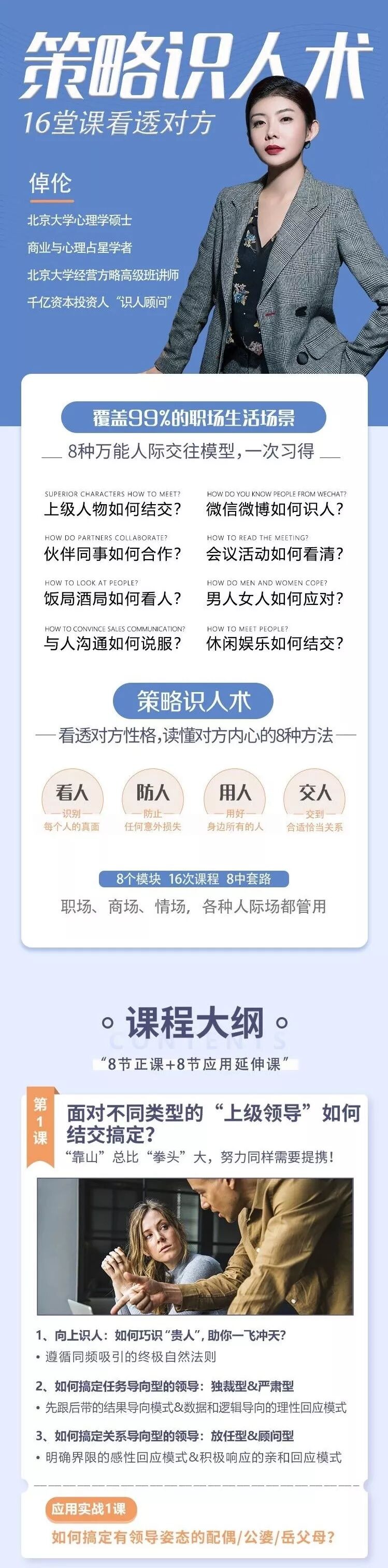 这一次,倬伦老师把她打造的《北大心理学女神亲授:16堂策略识人课,5分钟看透人心,没有搞不定的人》倾囊相授,学会心理学识人的底层逻辑,让你轻松解决人际难题!