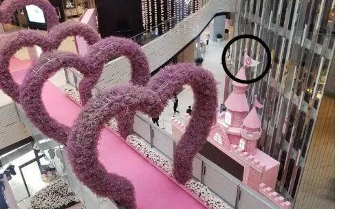现场一片粉红色的花海,城堡顶上飘着“M”旗,还特意拼了英文“Iloveyou”的走廊。
