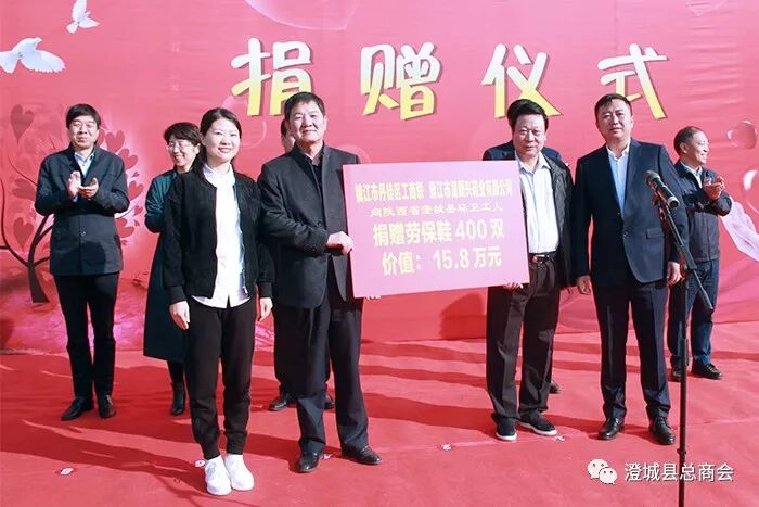 10月18日,丹徒区工商联、镇江市晟顺兴鞋业有限公司向我县400名环卫工人捐赠了价值15.8万元的劳保鞋。丹徒区工商联主席(商会会长)殷晓丹,中共澄城县委常委、副县长李扩,县委常委、统战部长段武学,县委常委、副县长殷利民,县人大常委会副主任李真参加活动。活动由县政协副主席、县工商联主席潘中锋主持。