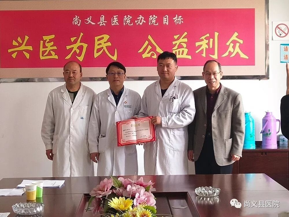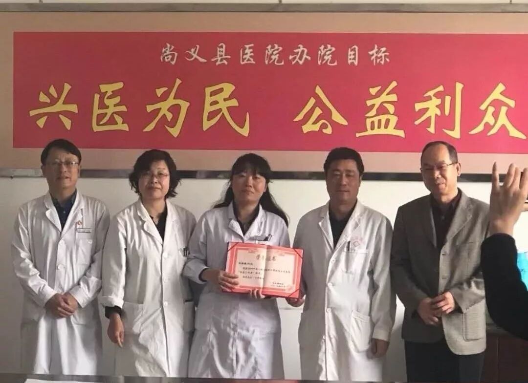尚义县医院为张家口市第一医院葛鹏飞、赵海梅两位结束帮扶工作的同志颁发“先进工作者”荣誉证书。