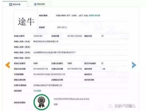 第16004180号“途牛”商标由青岛百奕名车汇商贸有限公司于2014年12月24日提出注册申请。2017年7月4日被准予注册,核定使用在第20类“折叠式躺椅、垫褥(亚麻制品除外)”等商品上。