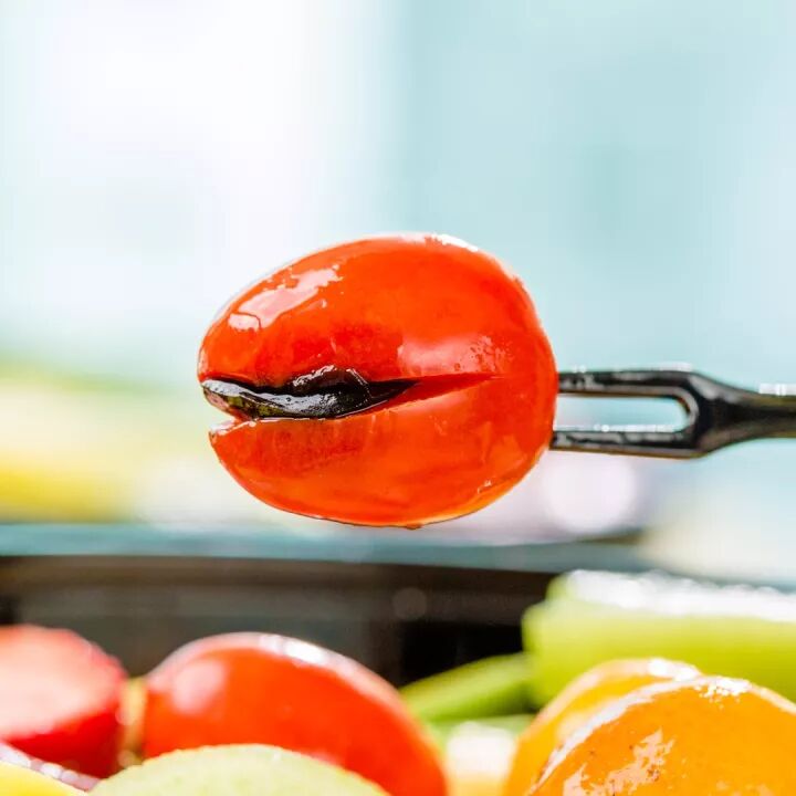 将甘草酸梅汁均匀淋在水果上,果肉和甘草汁之间的融合 ,原本的酸涩都消失不见,取而代之的是水果的香甜和甘草的清香