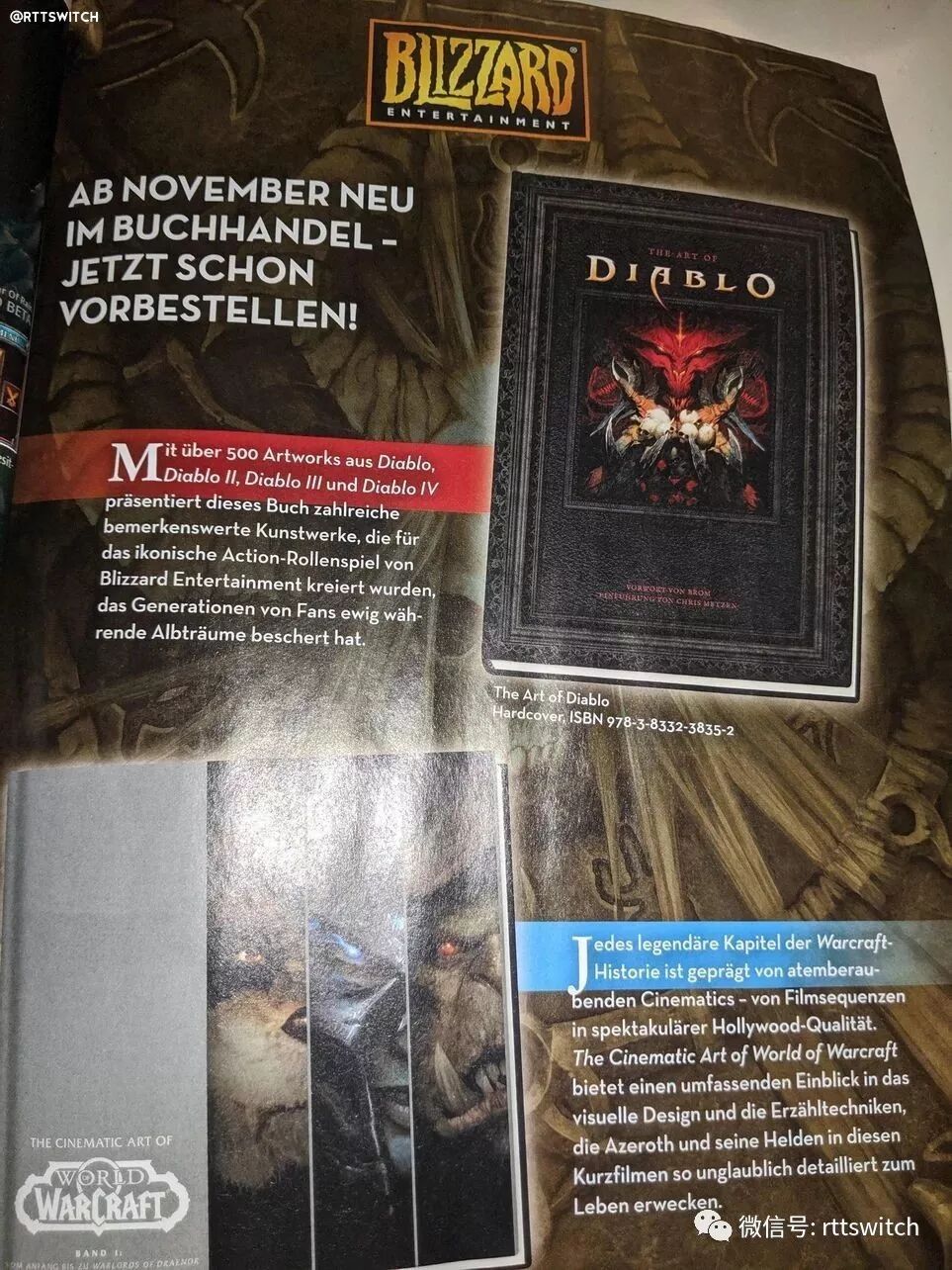 这则广告刊载在德媒Gamestar新一期杂志的第27页,广告中称这一画集“包含了《暗黑破坏神》1-4代超过500幅插图。”这一画集由暴雪内部资深作者Robert Brooks负责编写,不过没法保证是广告中的用词错误还是发错了时间。